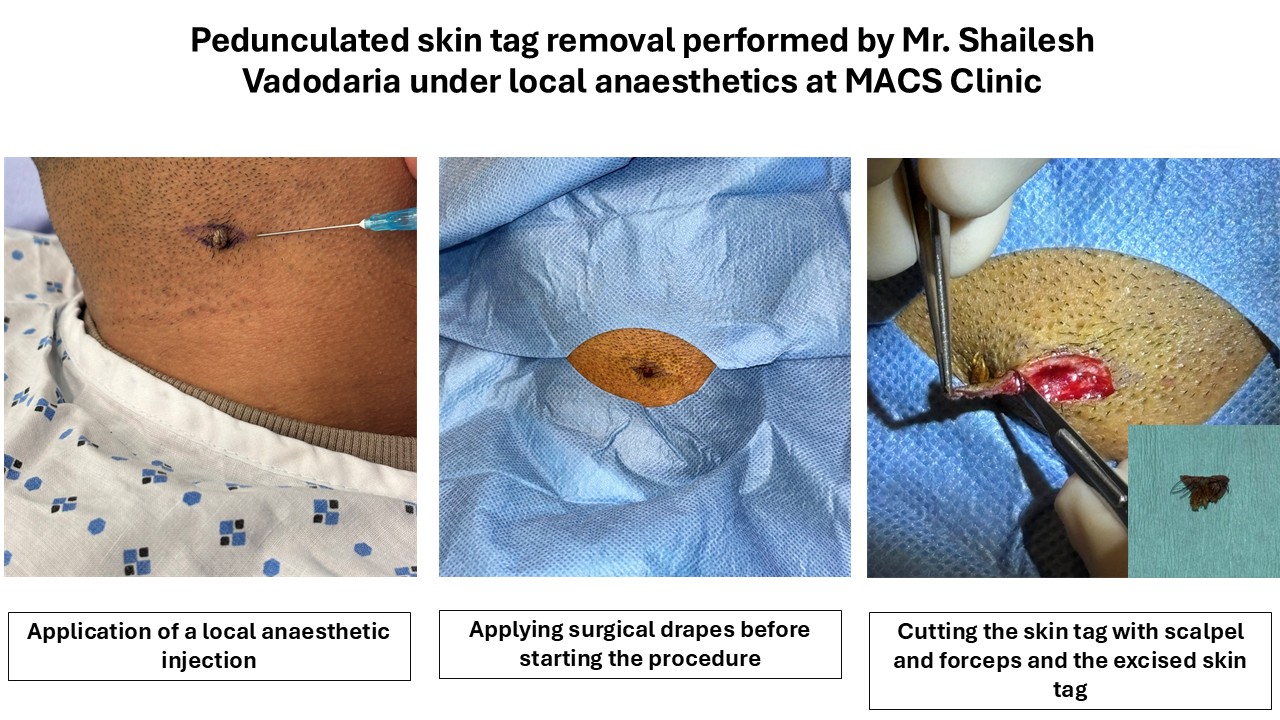 Pedunculated skin tags (medically known as acrochordons or squamous cell papillomas) are benign growths of skin that appear as soft, flesh-coloured or slightly darker lesions attached to the skin by a narrow stalk (peduncle).