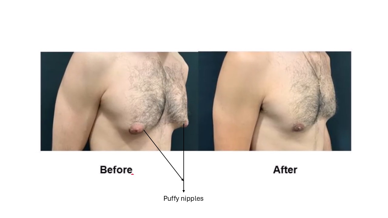 We have started seeing many more patients developing puffy nipples because of consumption of steroids/testosterone because of body building.