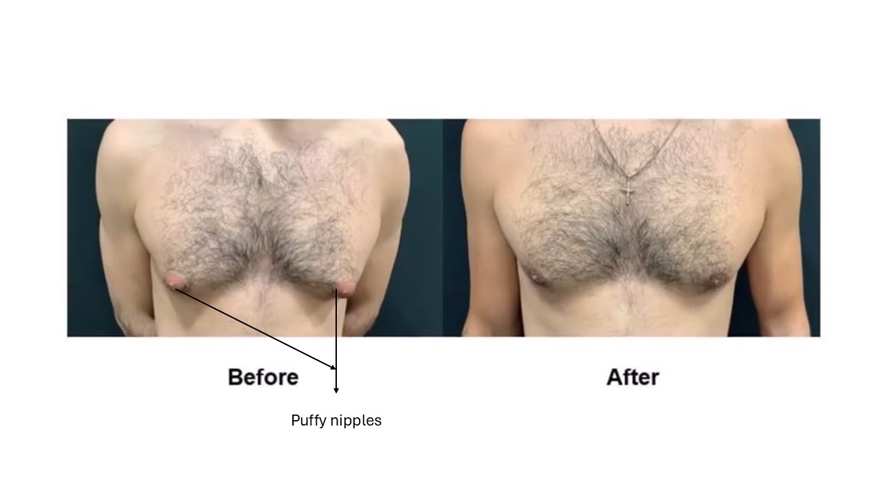 - Improves chest contour and nipple puffiness