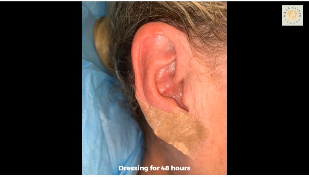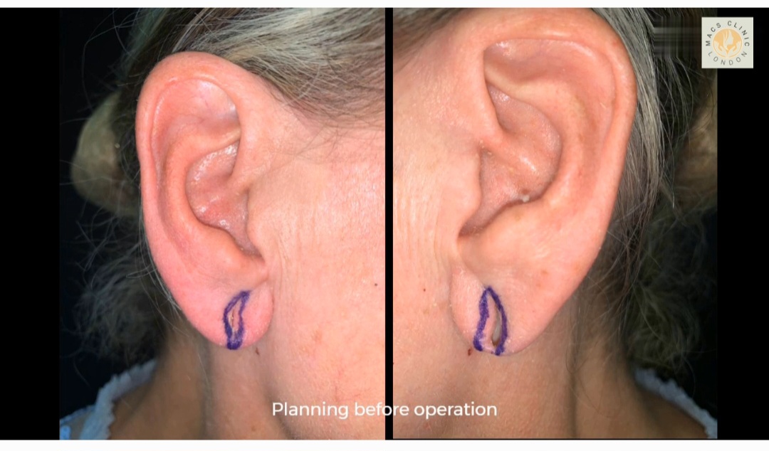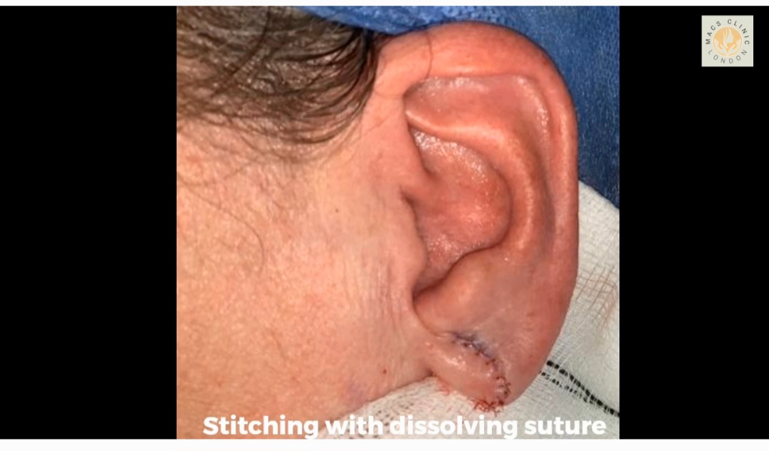 After this, the edge of the split ear lobule is cut and a small part of the skin is removed and restitched using barely visible dissolving sutures. The entire procedure takes 20 minutes.