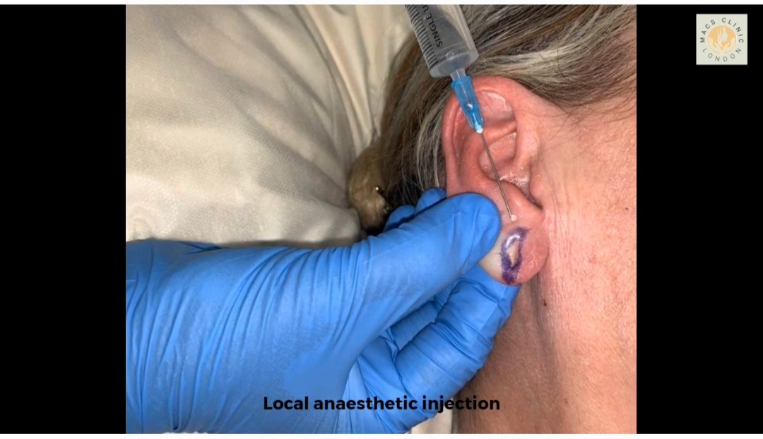 First, the area is cleaned and disinfected, before local anaesthesia is injected into the ear to numb it for surgery.